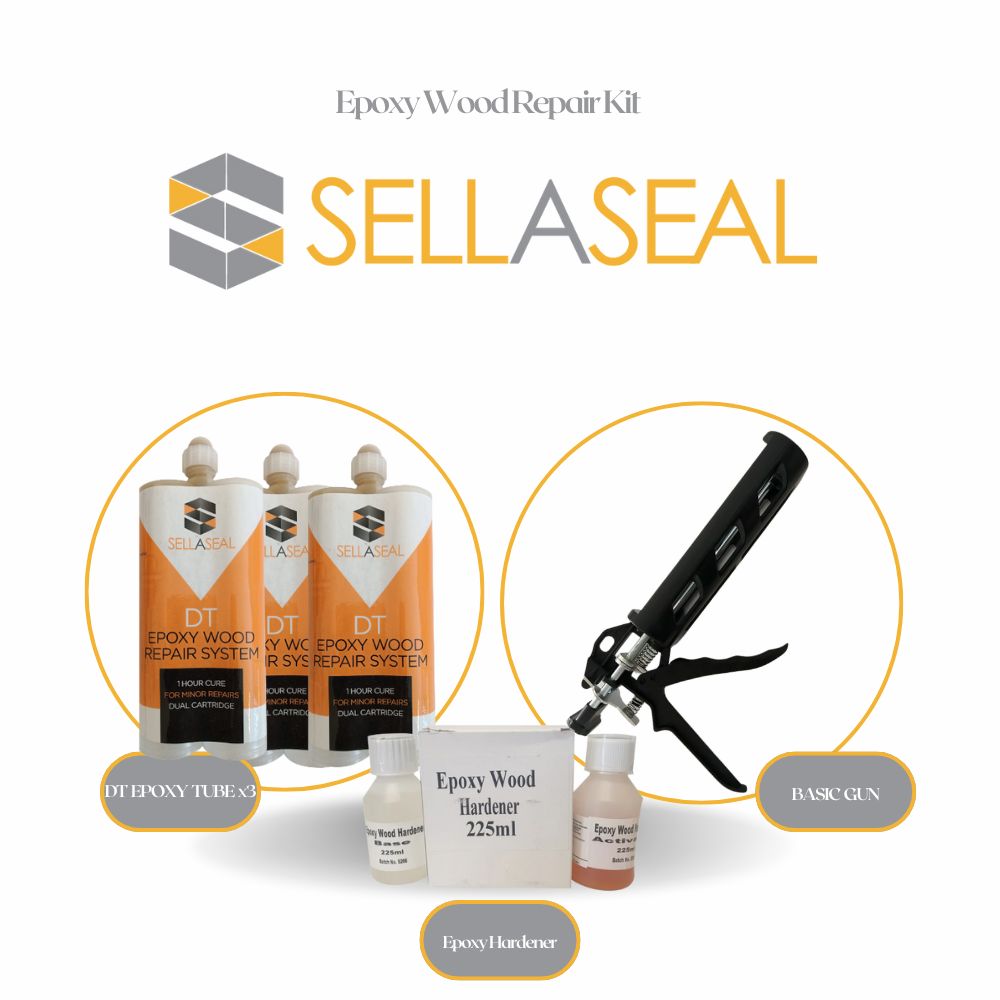 This pack includes 3 tubes of Sellaseal's DT Epoxy, 1 x Epoxy Gun, and 1 x Epoxy Wood Stabilizer Kit, providing all you need to remove and stabilize a rotten timber area, then fill and shape ready for painting.
