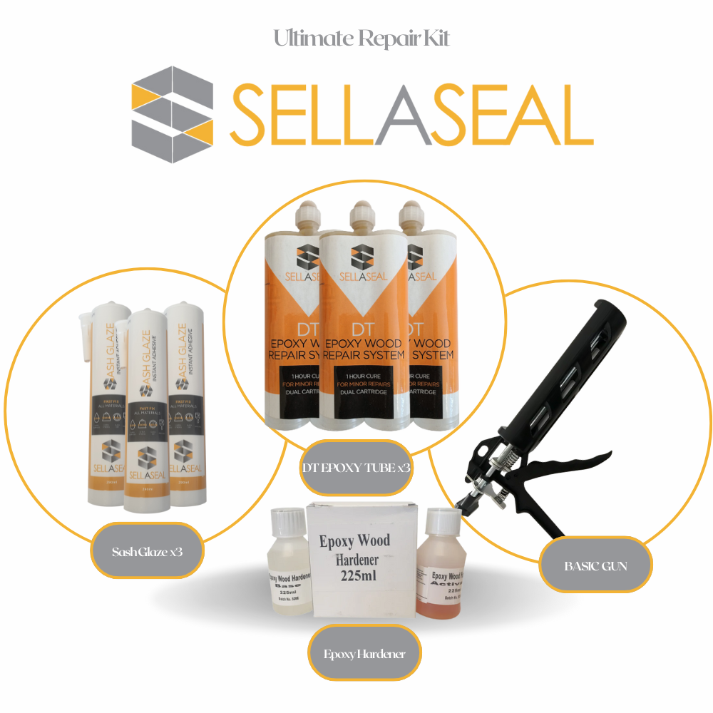 This pack includes 3 Tubes of Sellaseals Sash Glaze, 3 tubes of Sellaseal's DT Epoxy, 1 x Epoxy Gun, and 1 x Epoxy Wood Stabilizer Kit, providing all you need to remove and stabilize a rotten timber area, then fill and shape ready for painting along with reglazing sashes or repairing loose putty.